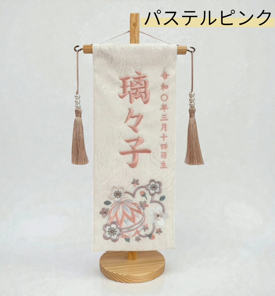 【急ぎ対応】名前旗 総刺繍 まり桜 (小)ペイズリー柄 アイボリー くすみピンク刺繍 クリスタル付 パール吊るし(1318)