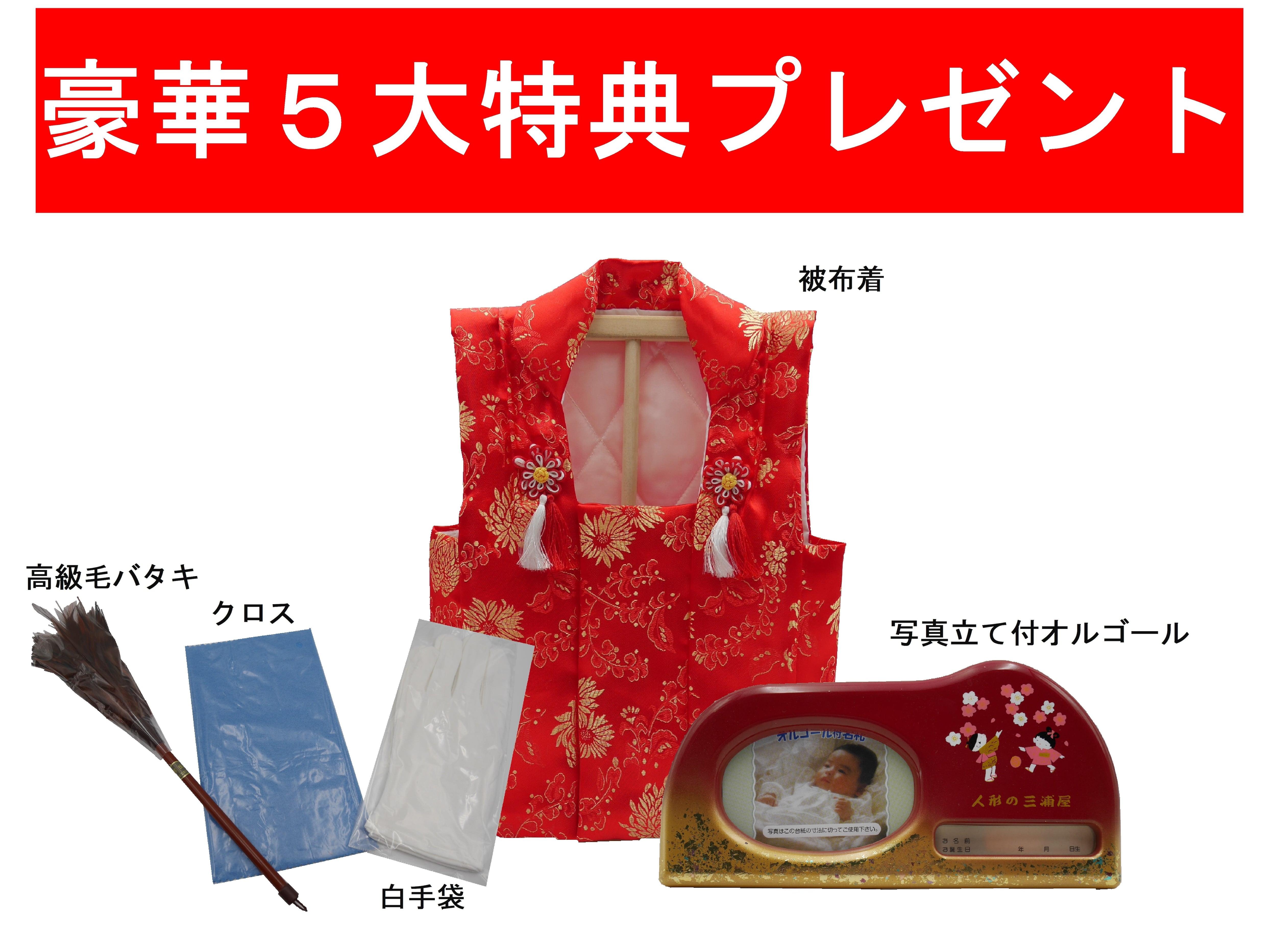 豪華5大特典は、高級毛ばたき・クロス・白手袋・写真立て付オルゴール・被布着になります。