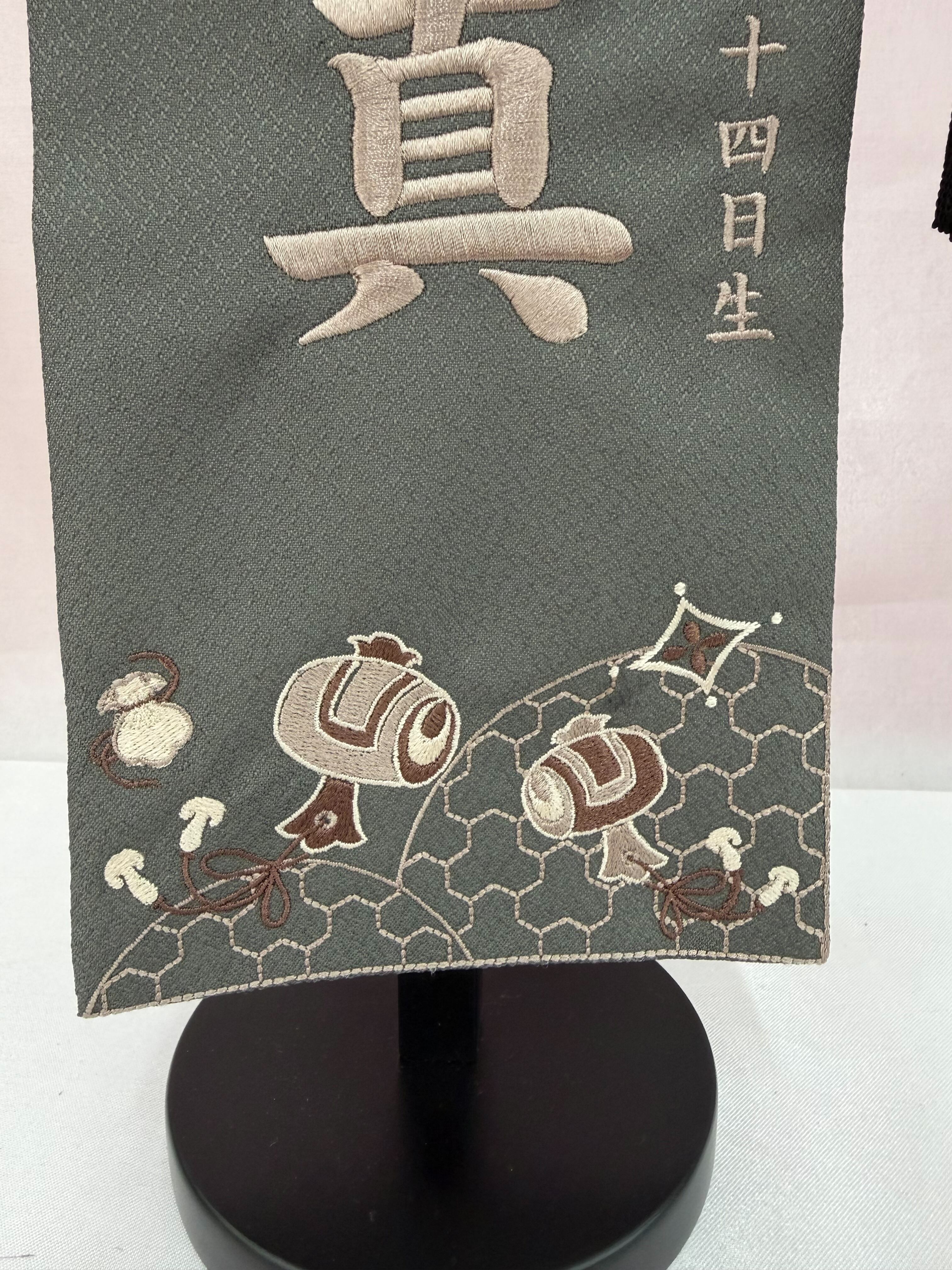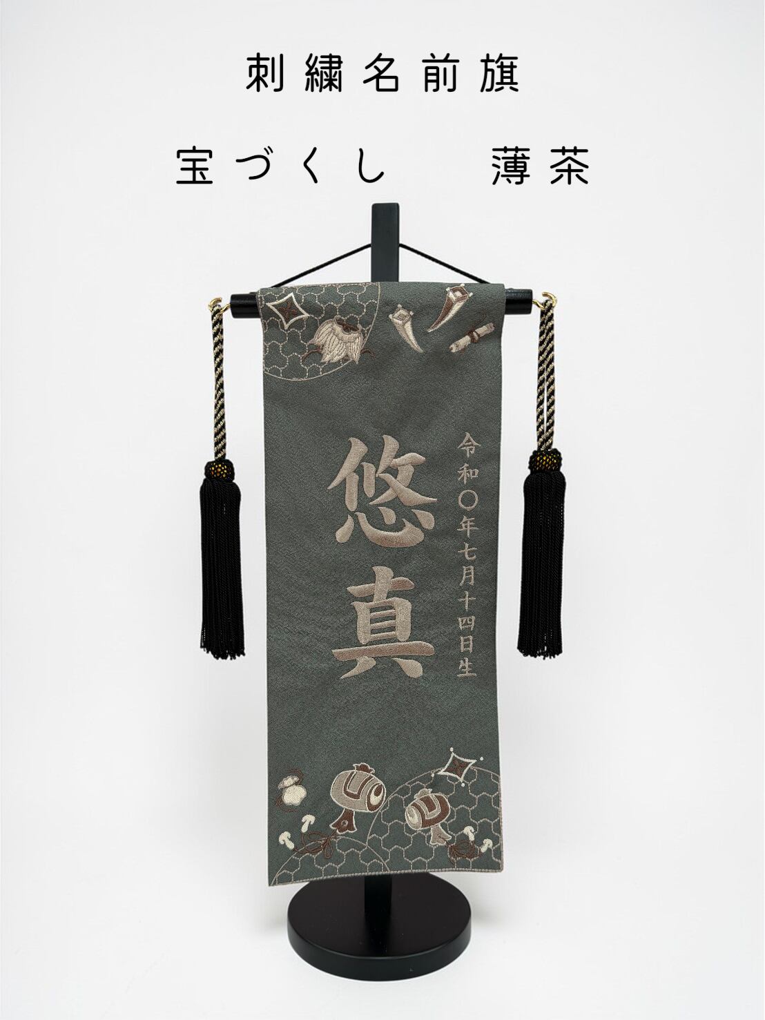 【急ぎ対応】名前旗 総刺繍 宝づくし(小)カーキ 黒房 薄茶(1551)