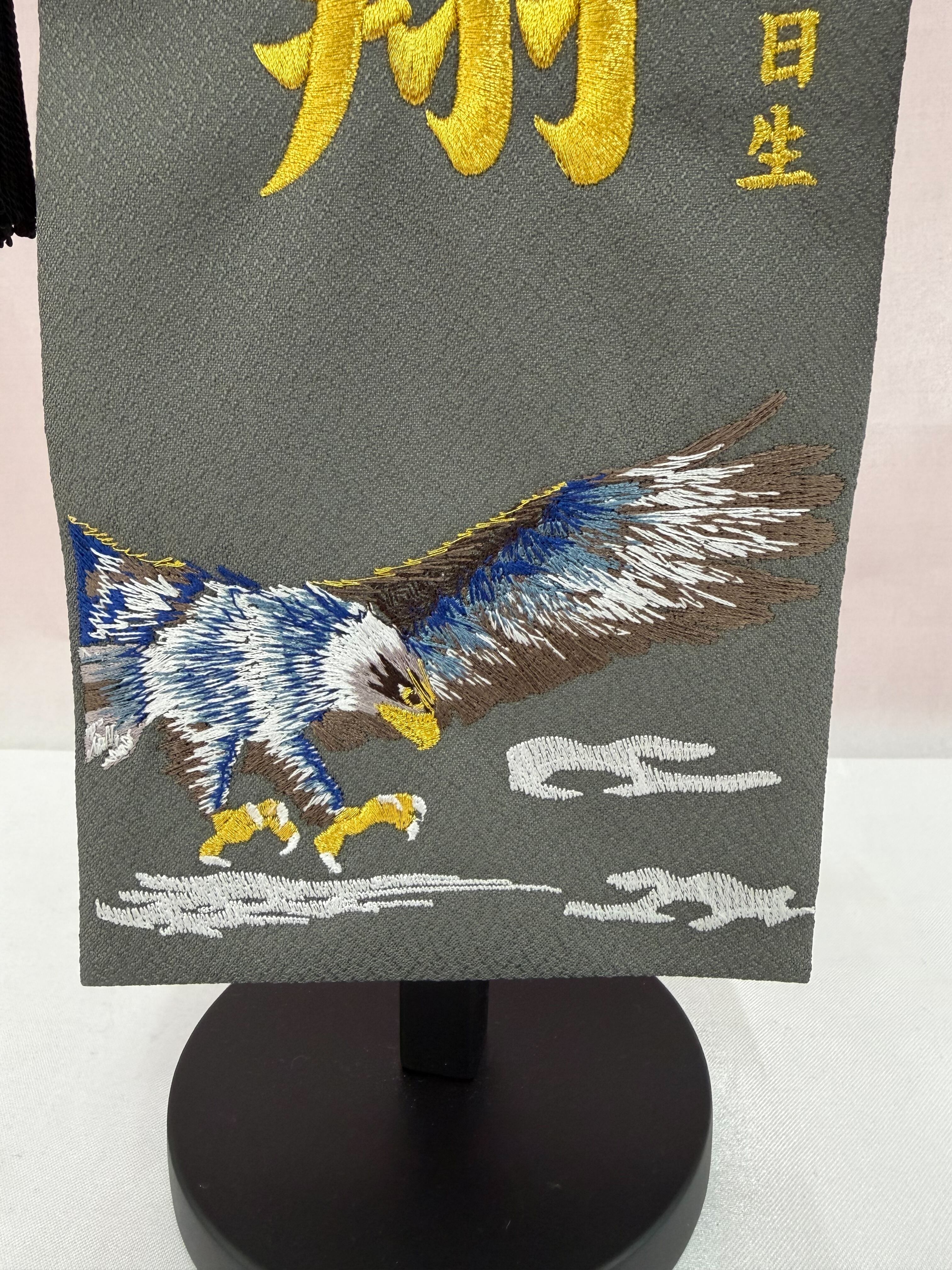 アムンゼン織りの生地に鷹の刺繍が入っており