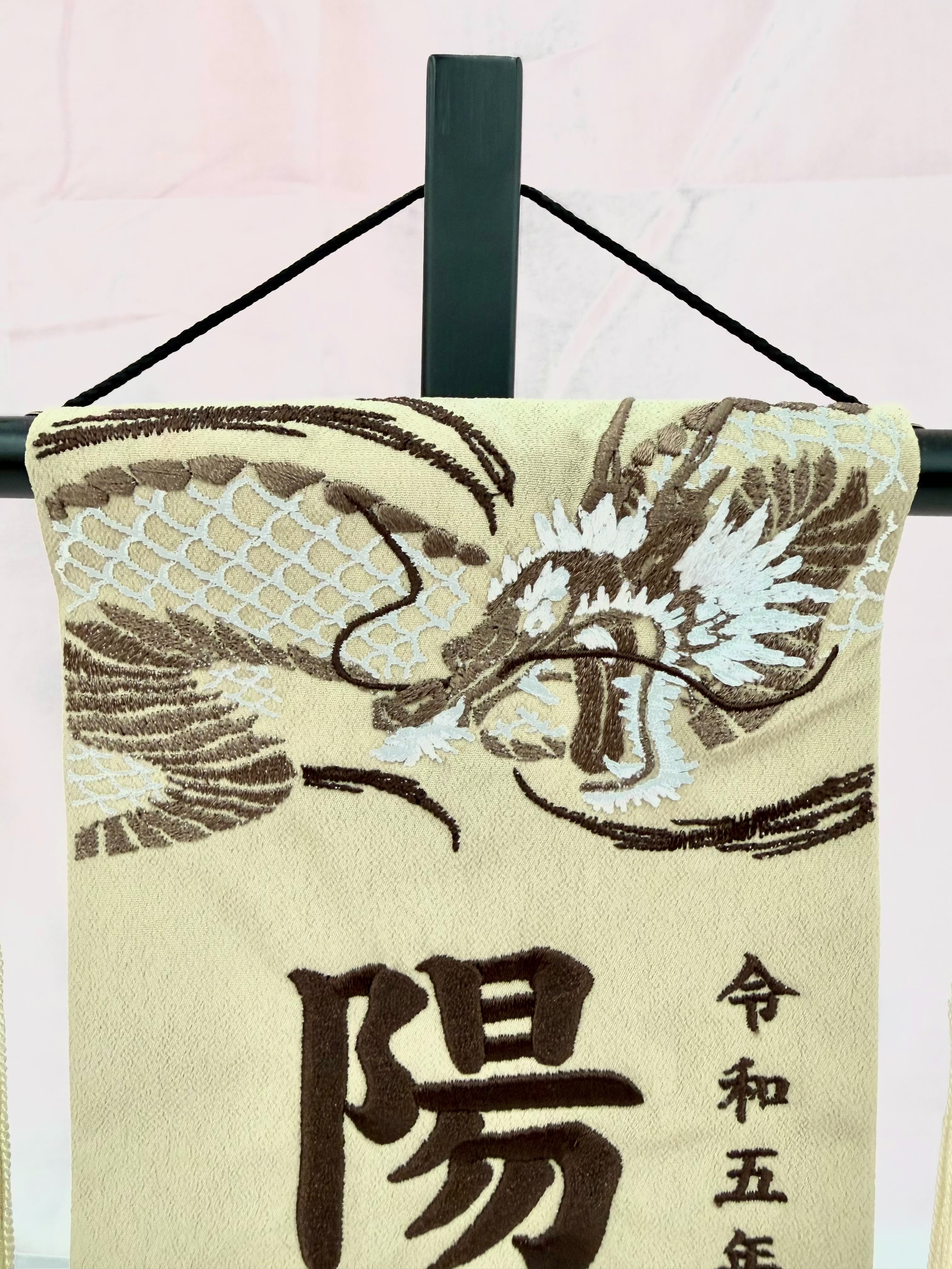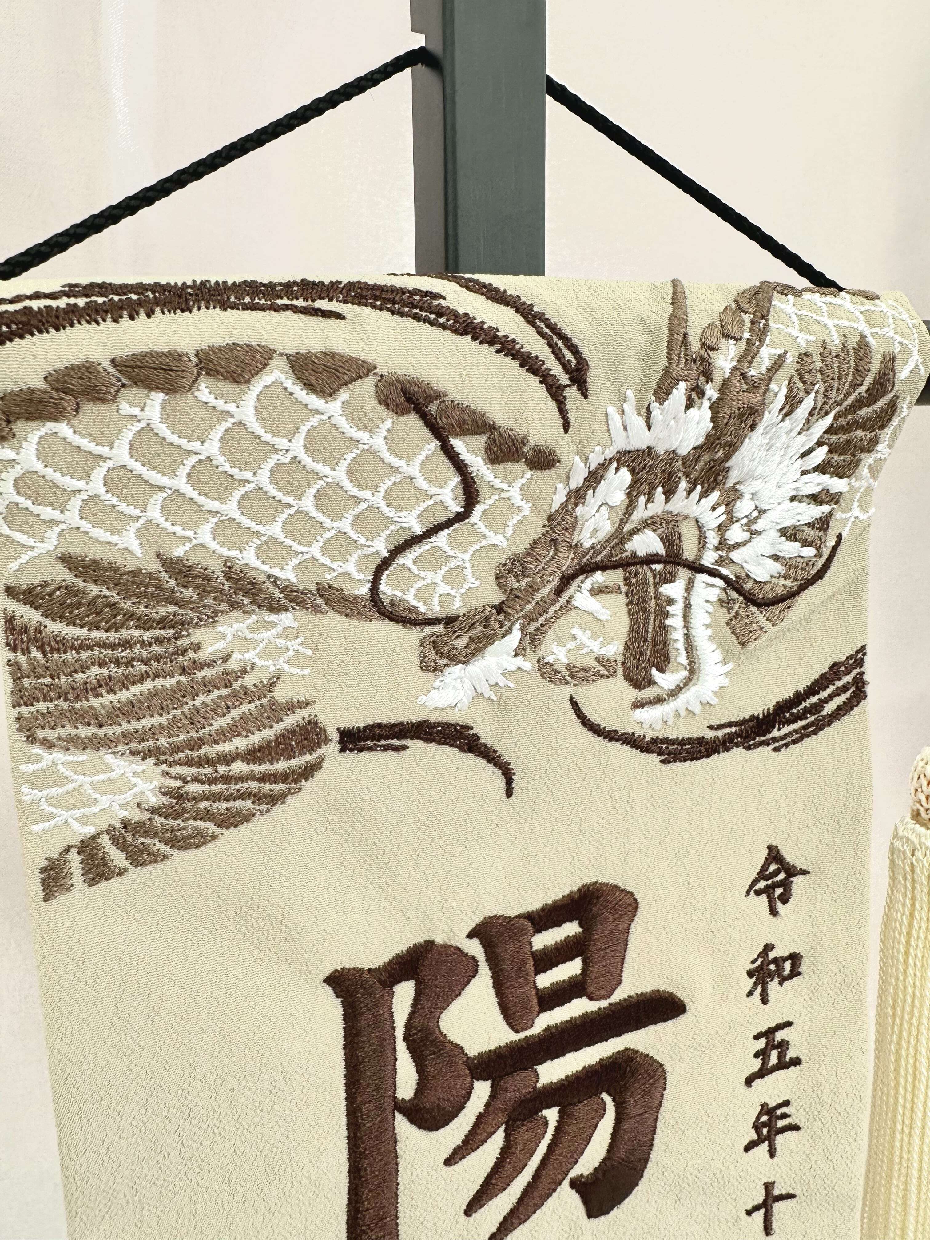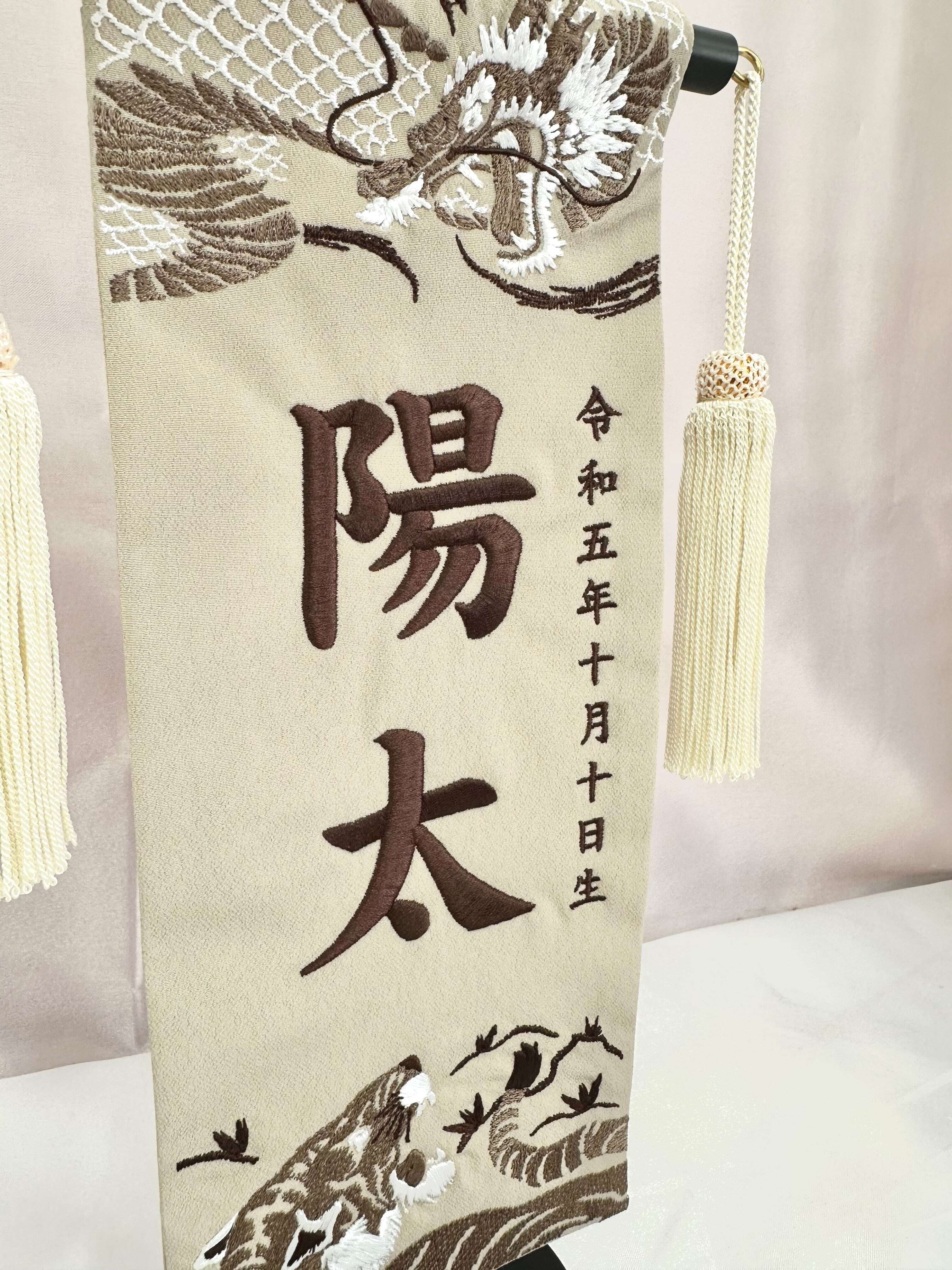 【急ぎ対応】名前旗 総刺繍 龍虎ベージュ(小)ベージュ ベージュ房 こげ茶(155)