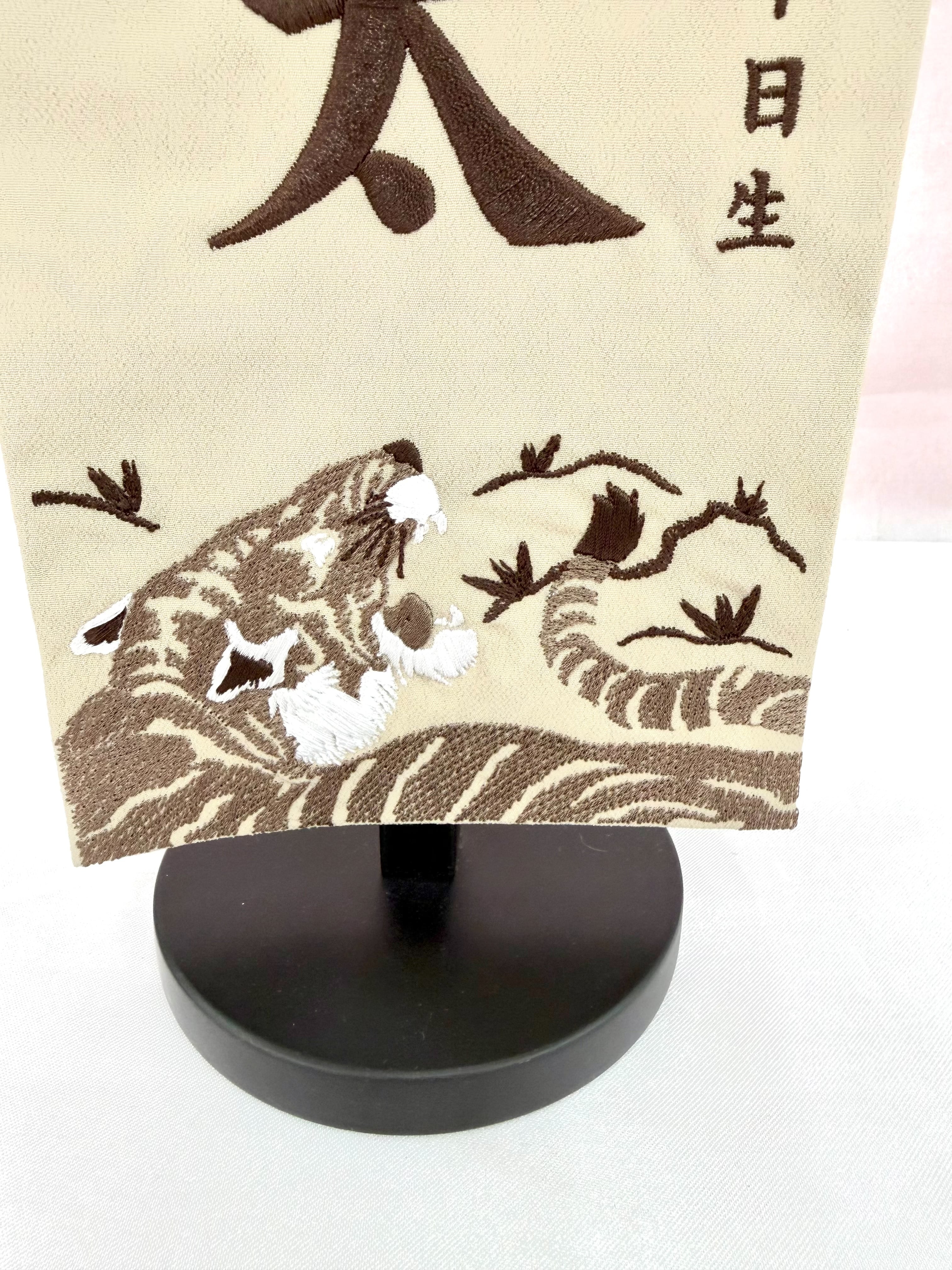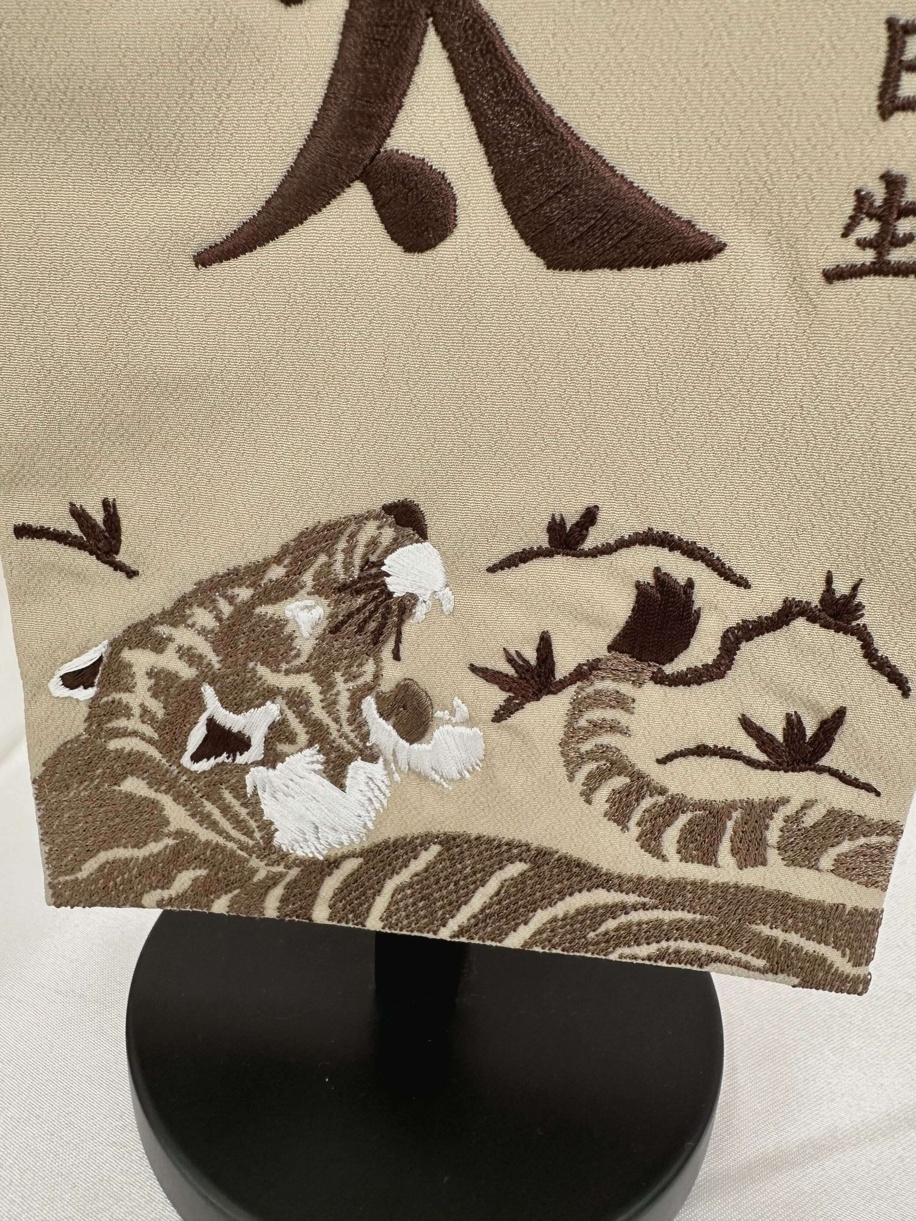 ちりめん織りの生地に龍虎の刺繍が入っており