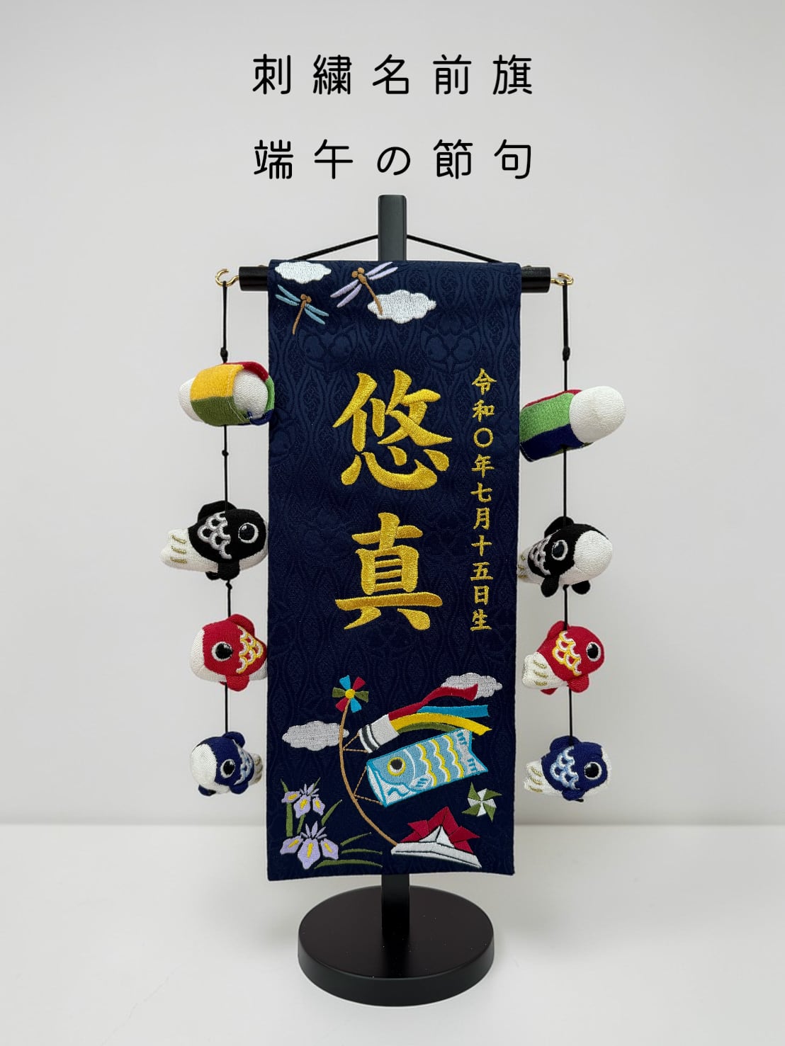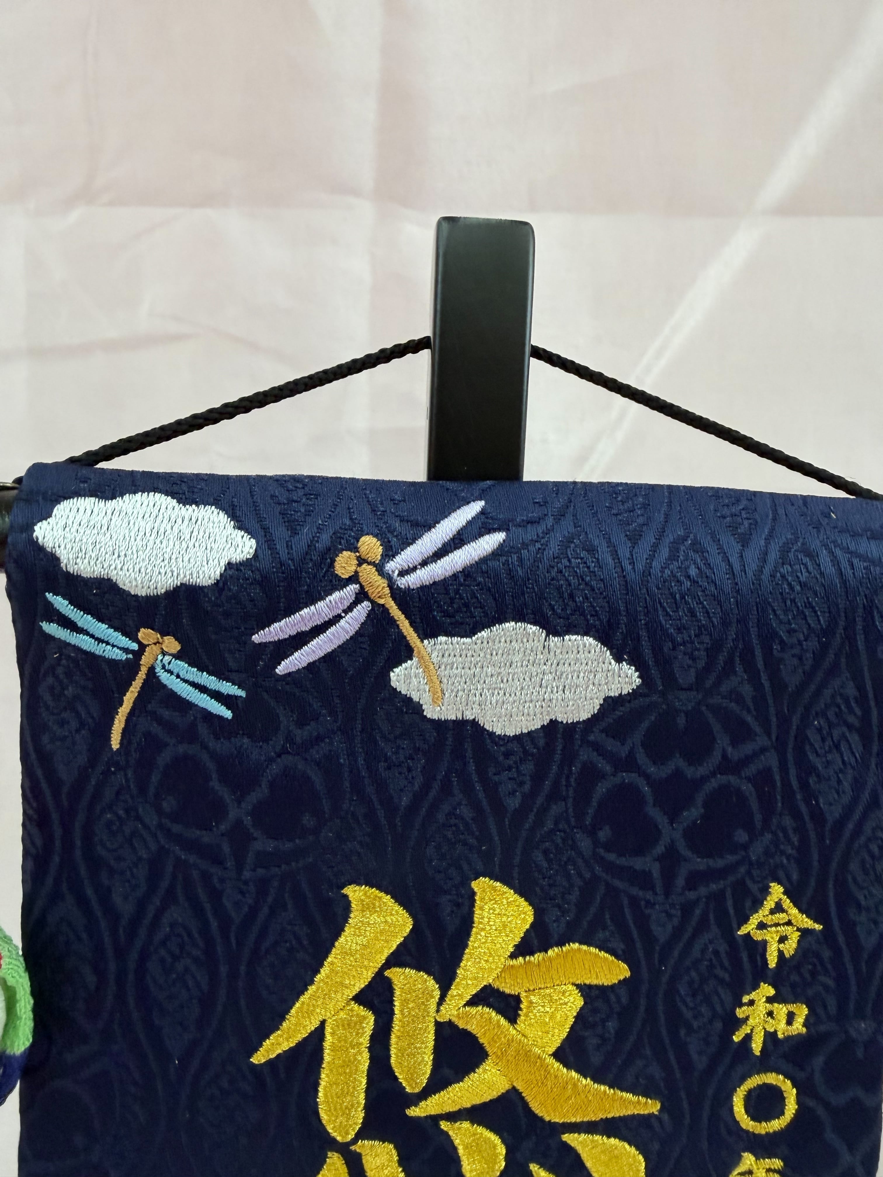 【急ぎ対応】名前旗 総刺繍 端午の節句(小)紺 鯉吊るし 金刺繍(1521)