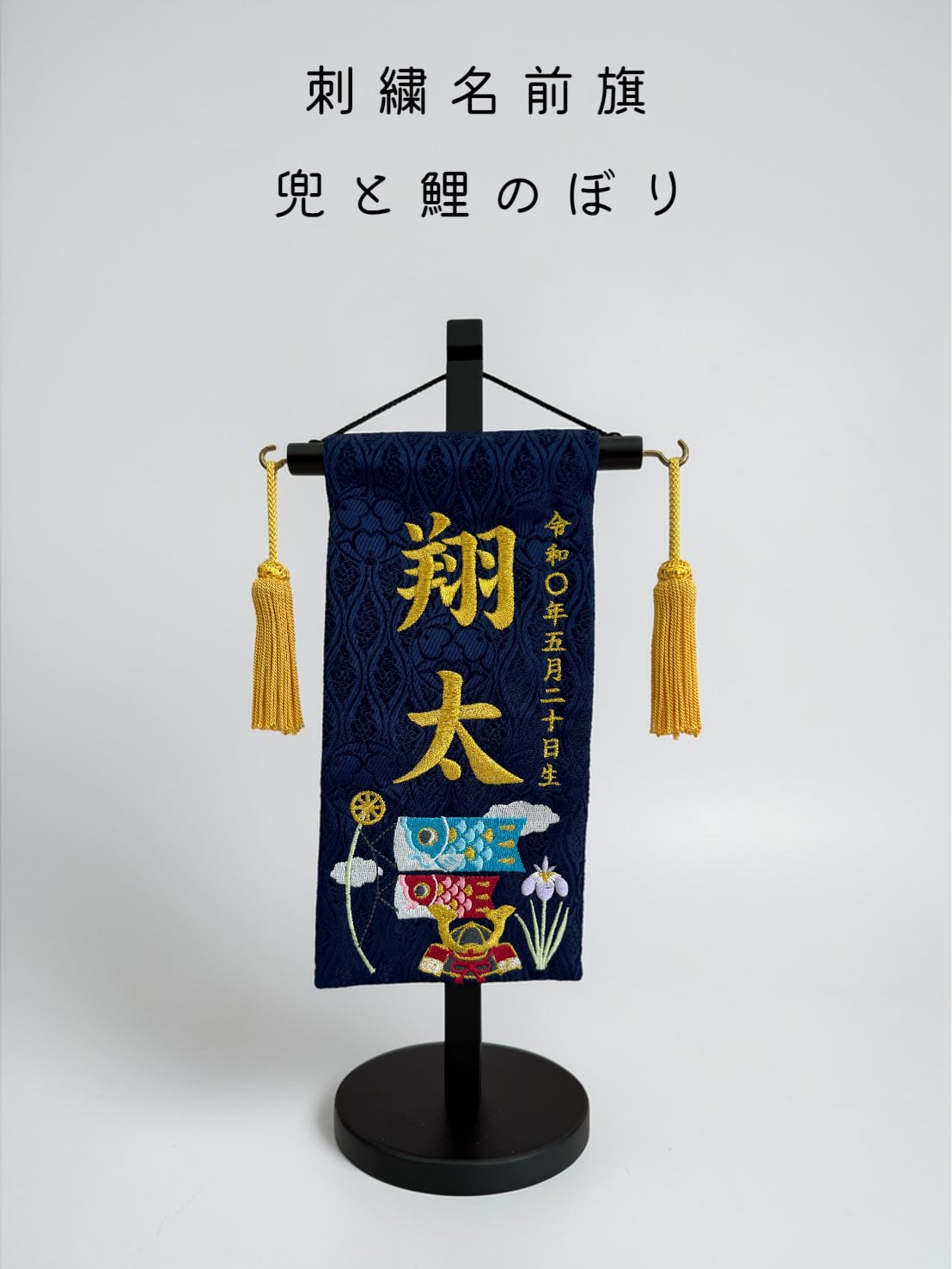 【急ぎ対応】名前旗 総刺繍 兜と鯉のぼり (特小) 紺生地 金房 金刺繍(1516)