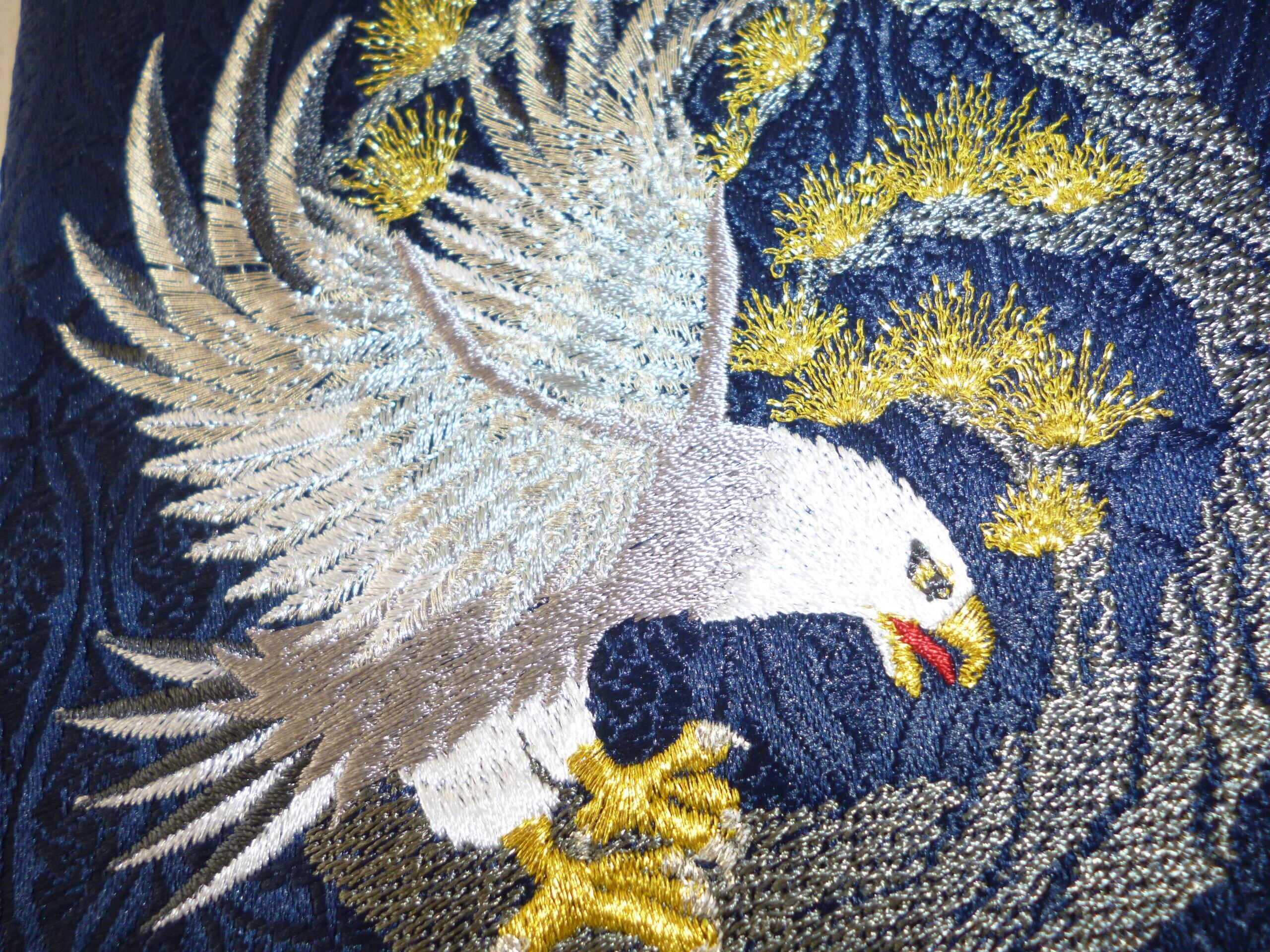 ジャガード織りの生地に鷹と松の刺繍が上下に入っており