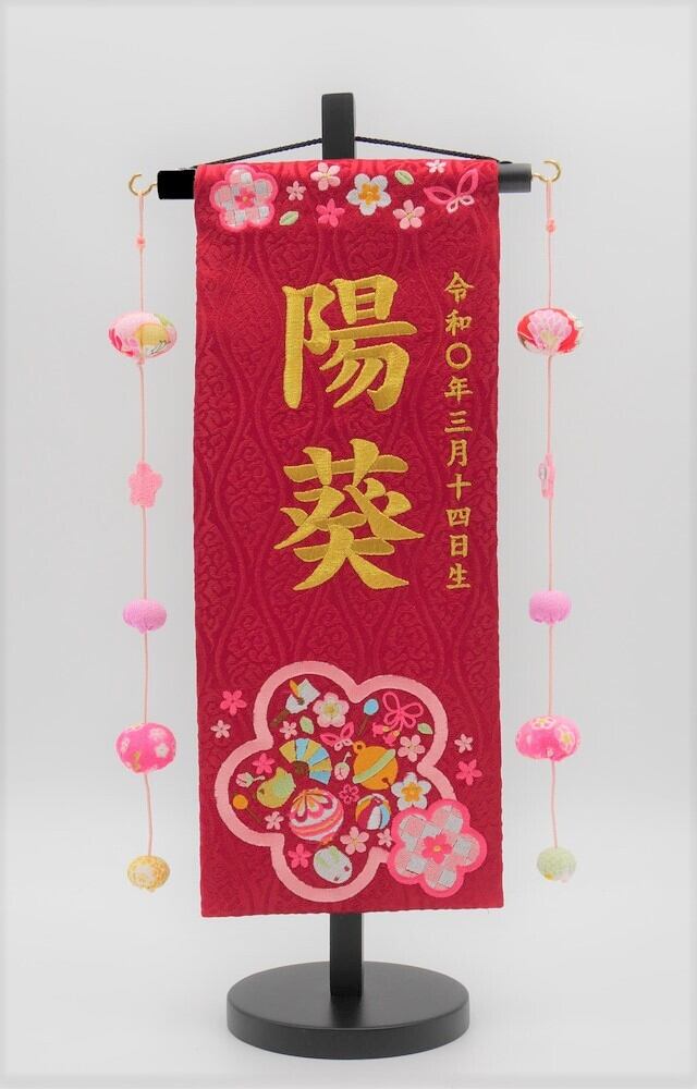送料無料! 名前旗 総刺繍桃の節句 (小) 赤生地 金 まり吊るし(1328)