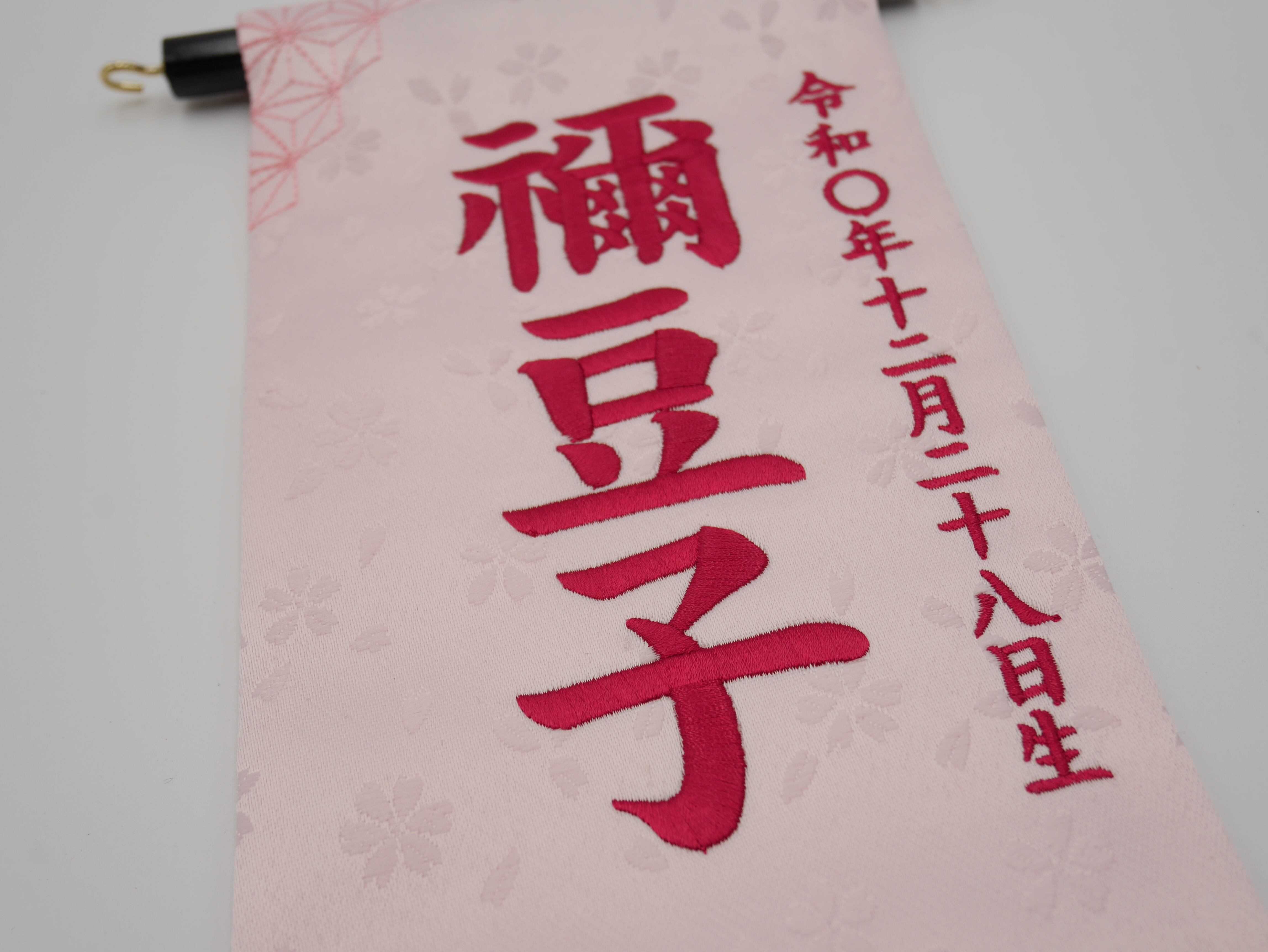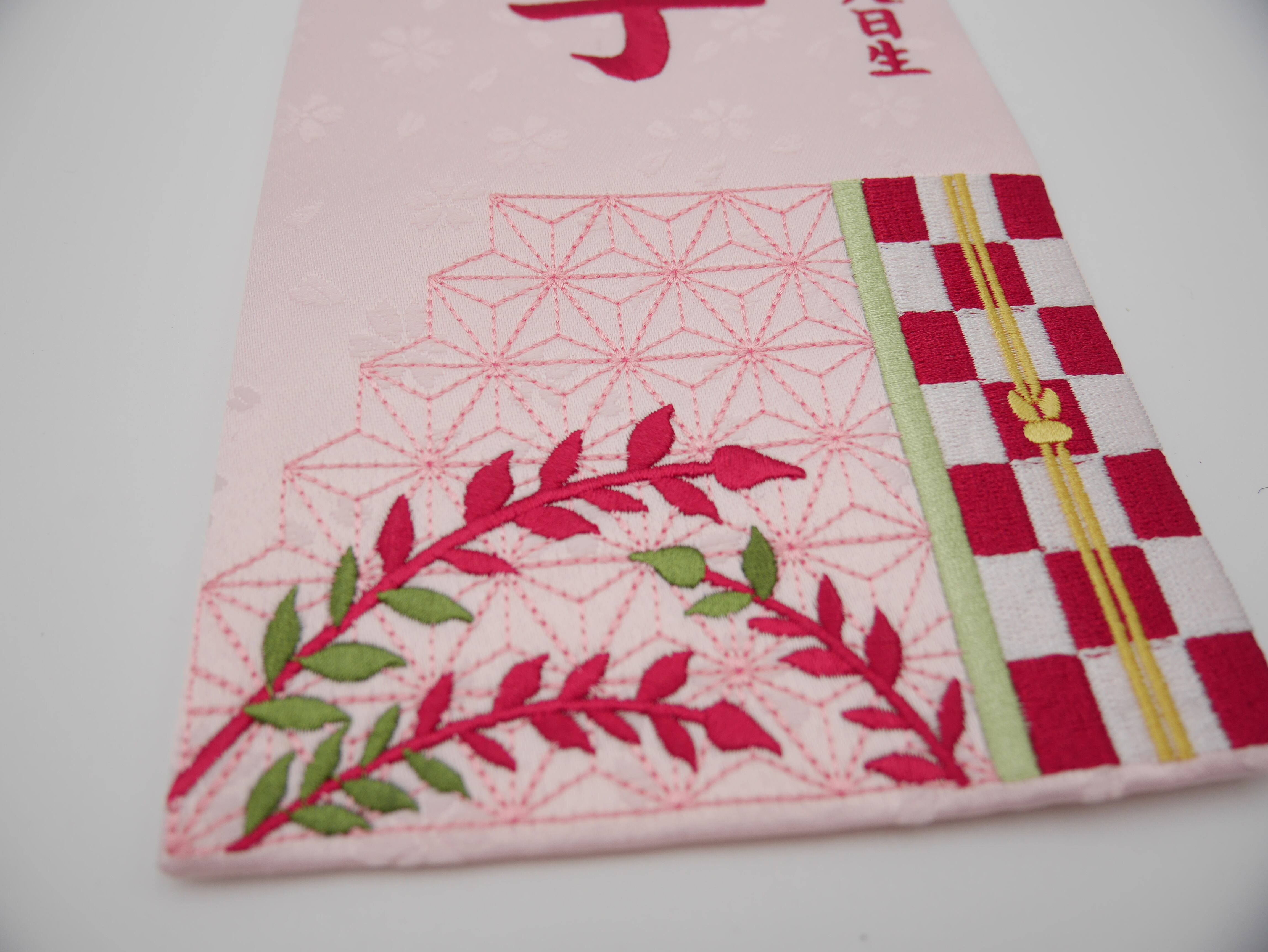 送料無料! 名前旗 鬼滅の刃風 禰豆子 総刺繍麻の葉文様(小) 薄ピンク ローズピンク 花吊るし(102)