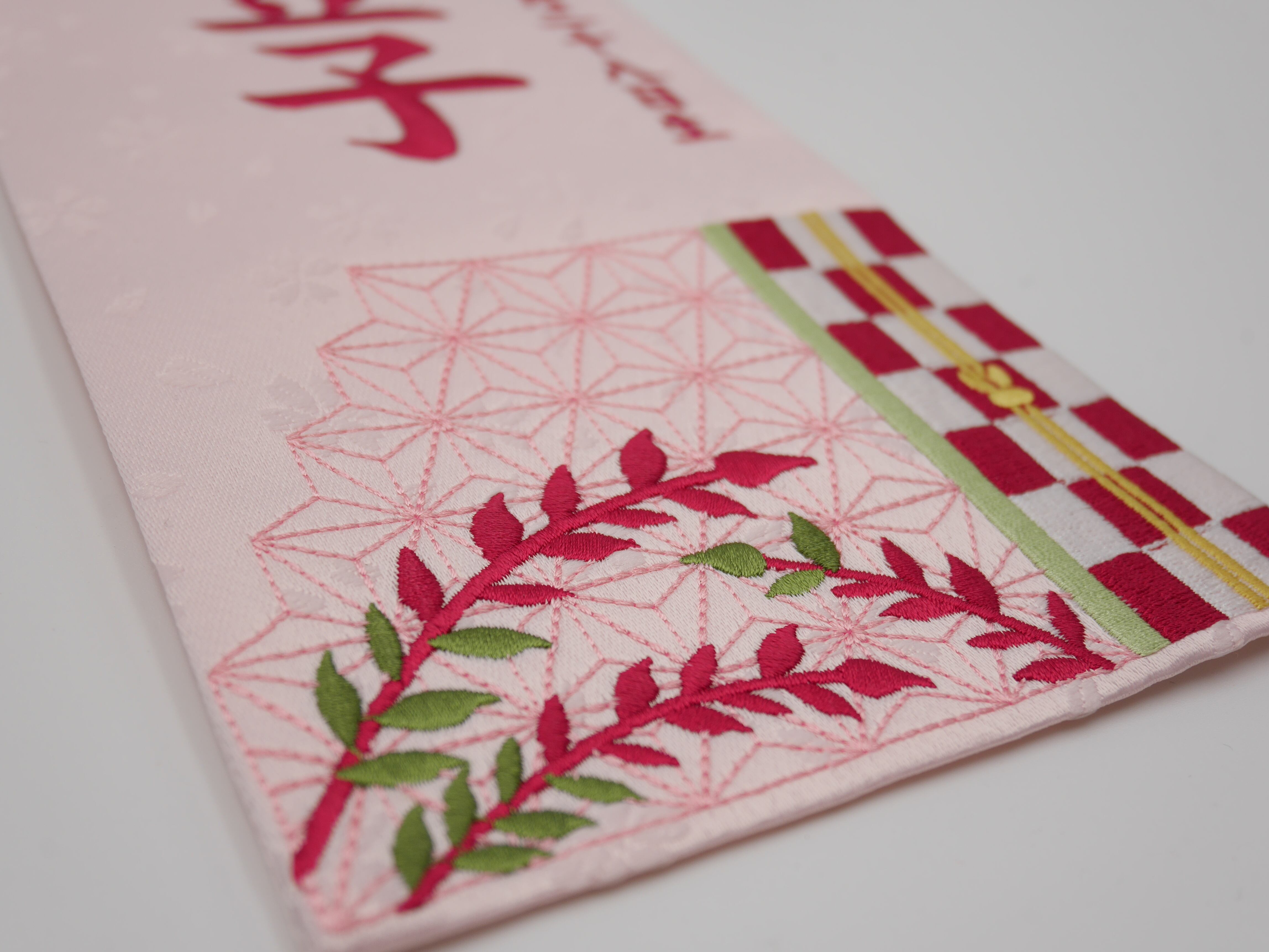 ジャガード織りの生地に刺繍で麻の葉文様刺繍が入っており